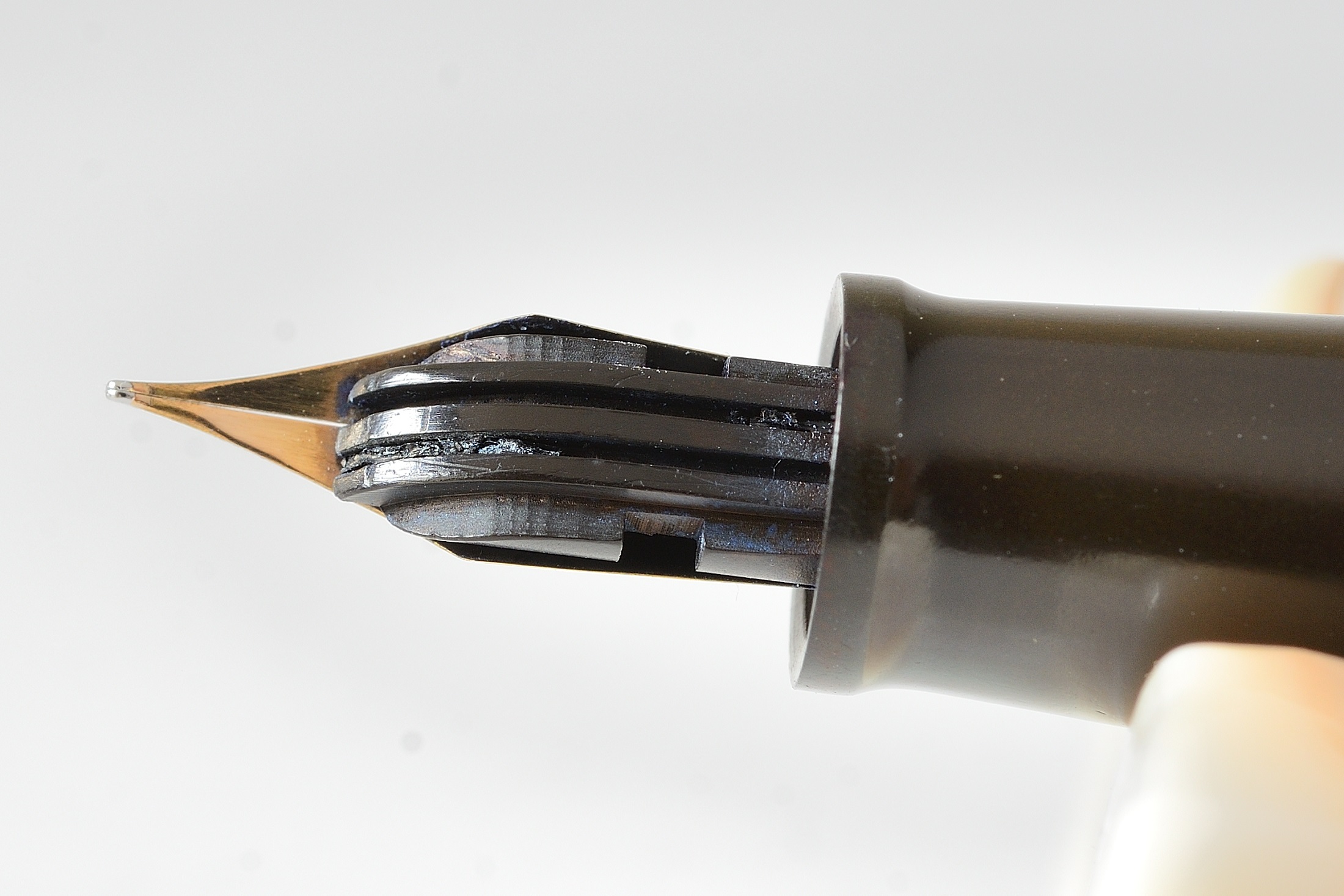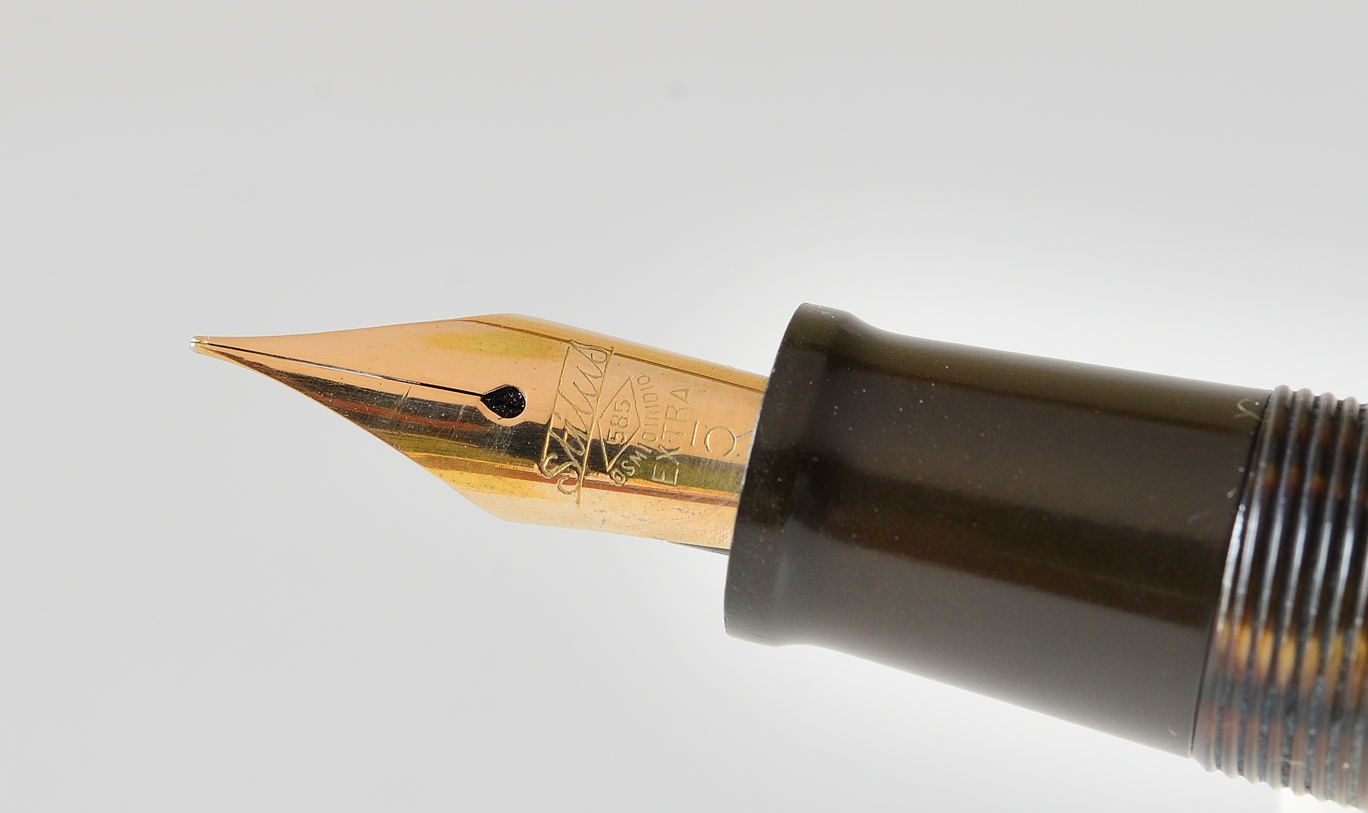 a pulsante di fondo. Al fusto è incisa un'ancora con la scritta ANCORA centrata, al fondello è inciso il numero 4. Purtroppo non ha il pennino originale, monta, invece, un pennino Stilus più o meno coevo, in oro 14k, sul pennino si legge Stilus scritto in corsivo, il titolo 585 in un rombo, con sotto la scritta osmiridio in stampatello, curvata lungo i lati inferiori del rombo, segue la scritta EXTRA e poi il numero 5. Anche la barra di pressione interna porta le incisioni dell'ancora e della scritta al centro. Sul wiki maggiori informazioni sulla serie 4 qui: https://www.fountainpen.it/Ancora_Serie_4 e sulla storia della produzione Ancora qui: https://www.fountainpen.it/Ancora/it