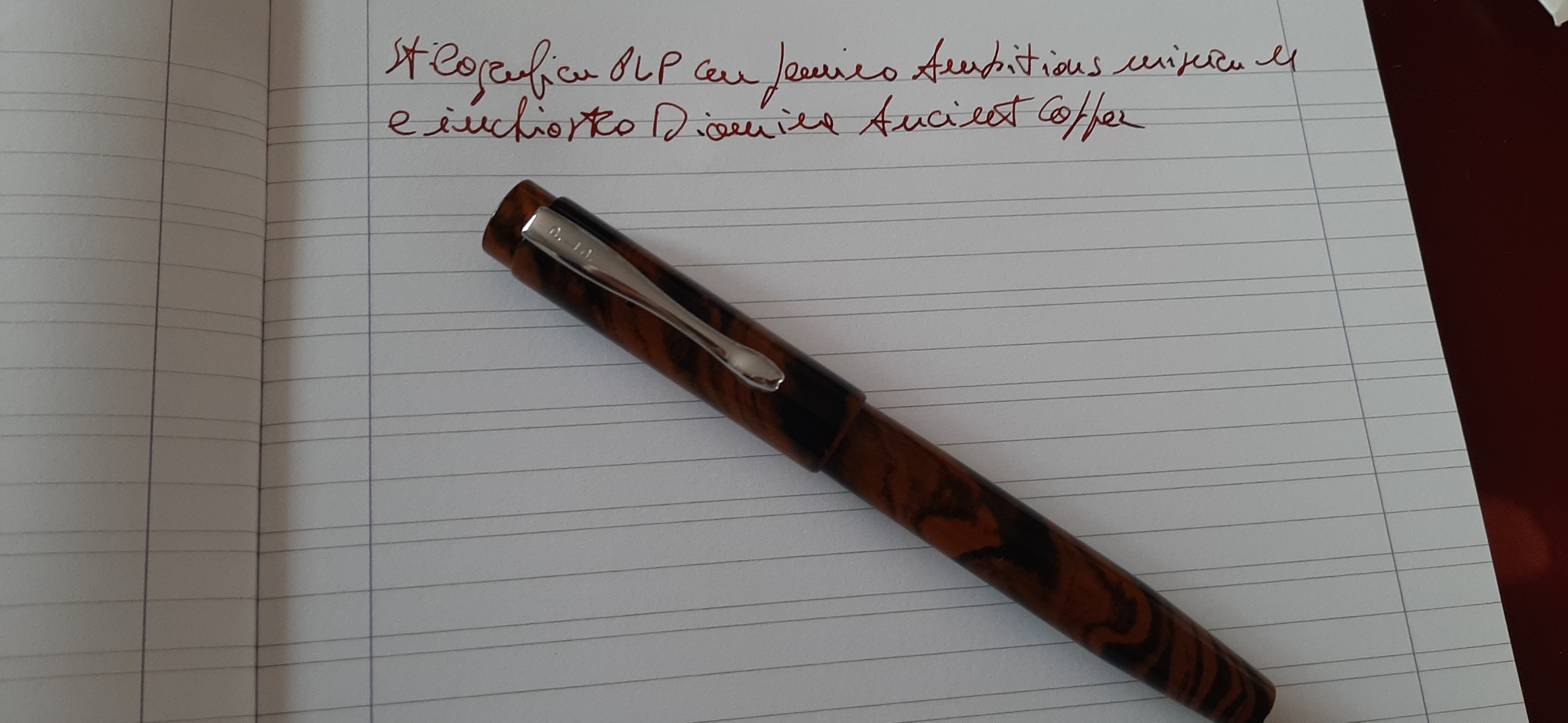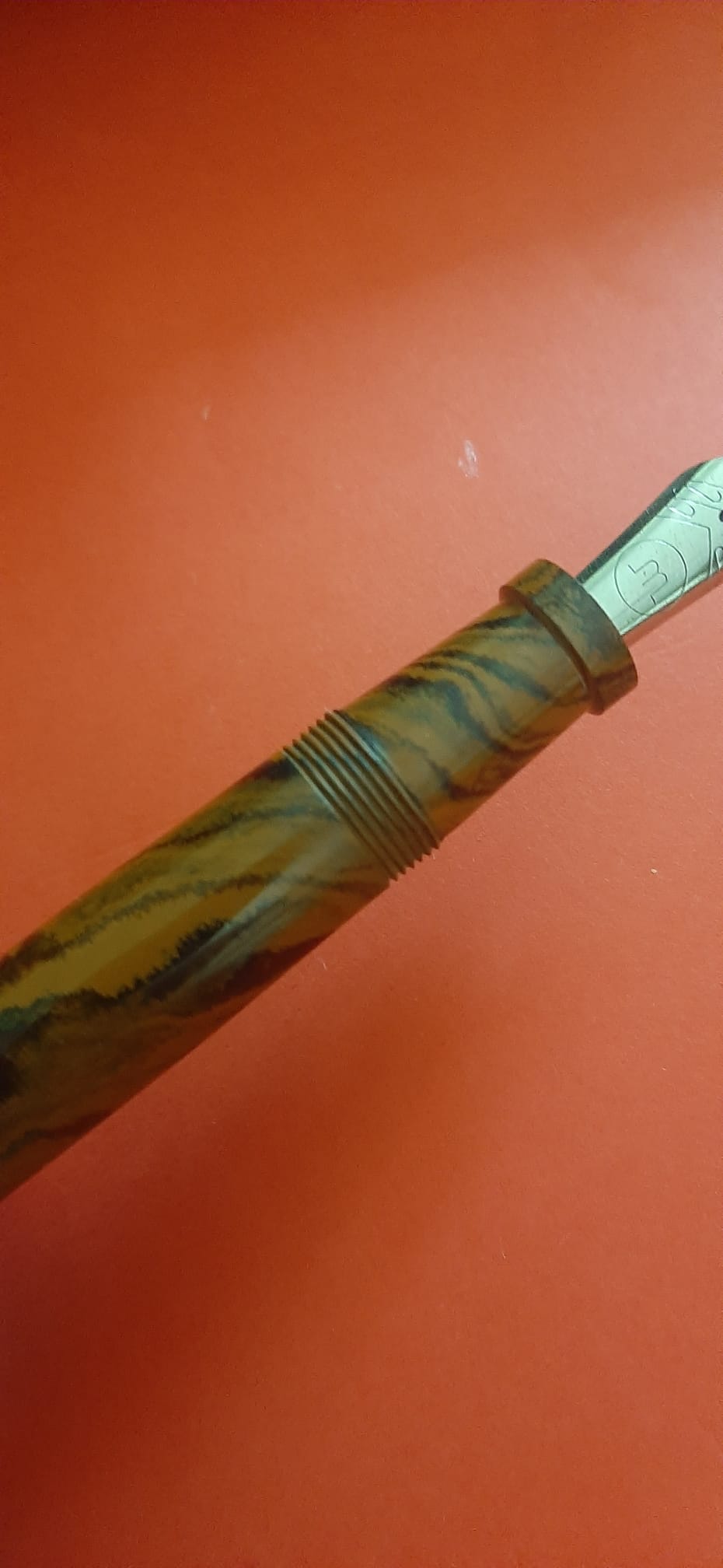 Grazie a tutti; mi sono aiutato con una spugnetta per piatti ( non ho la camera d'aria) e sono riuscito a svitare la sezione ( svita in senso antiorario); l'impressione è più che buona ( pareti spesse), caricata con Diamine Ancient Copper, scrive bene; una bella indianina .....