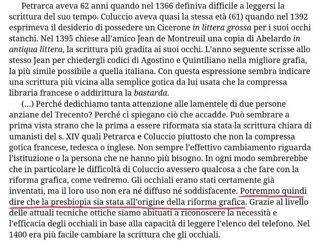 In effetti il ridurre il cambiamento della grafia ad un problema di presbiopia pare anche a me un po' tirato per i capelli, anche tenendo conto che la grafia umanistica usualmente é compilata con corpo lettera di dimensioni piuttosto contenute.