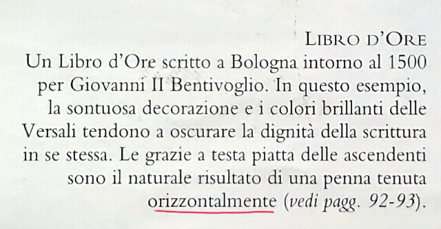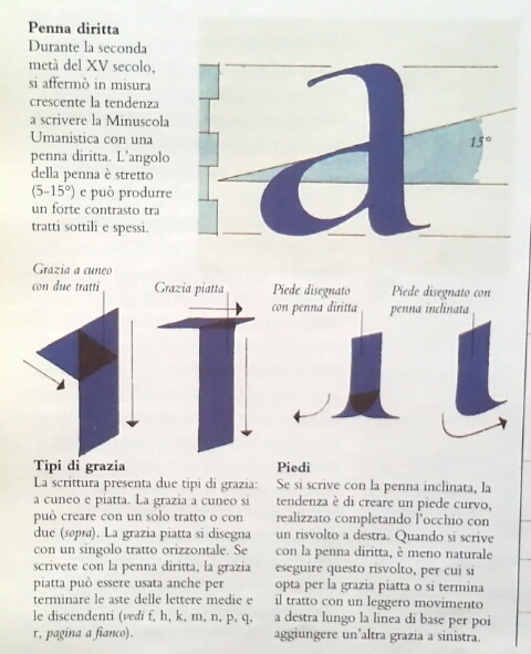 Come si può notare l’autrice non riporta la forma arcaica della “s” lunga usata in antichità (come si può notare nell’esempio precedente) forse perché ritiene (con ragione, secondo me) che il suo uso crei, al giorno d’oggi, problemi di leggibilità ai non addetti ai lavori. Vengono invece riportate due forme della “h” (quella con l’arco che finisce con la grazia verso destra più tarda) e due forme della “g”. Inoltre il grado calligrafico scelto per ascendenti e discendenti pari a 5 richiede un interlinea molto ampio che dona, a mio avviso, un’eleganza particolare allo scritto.