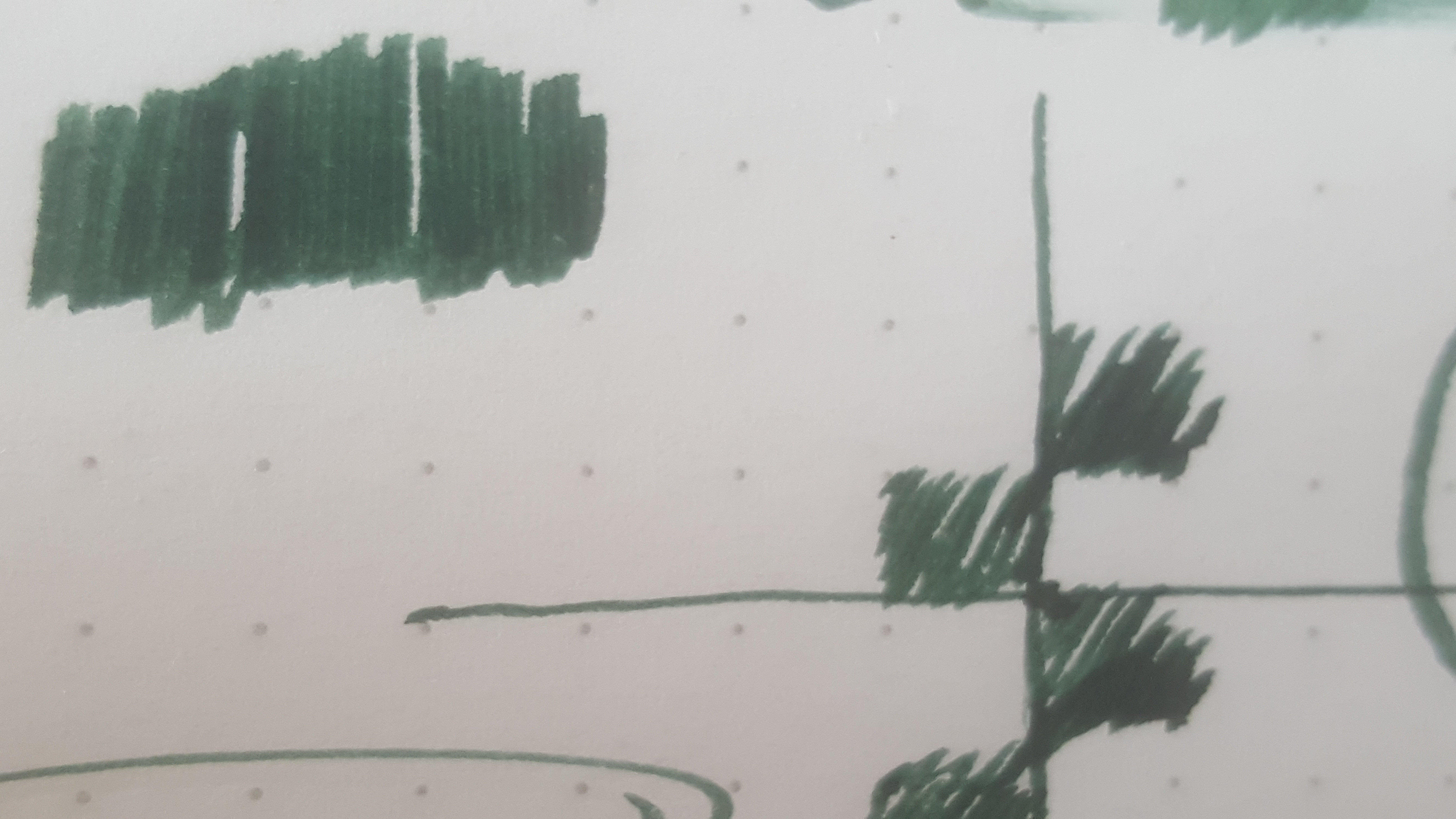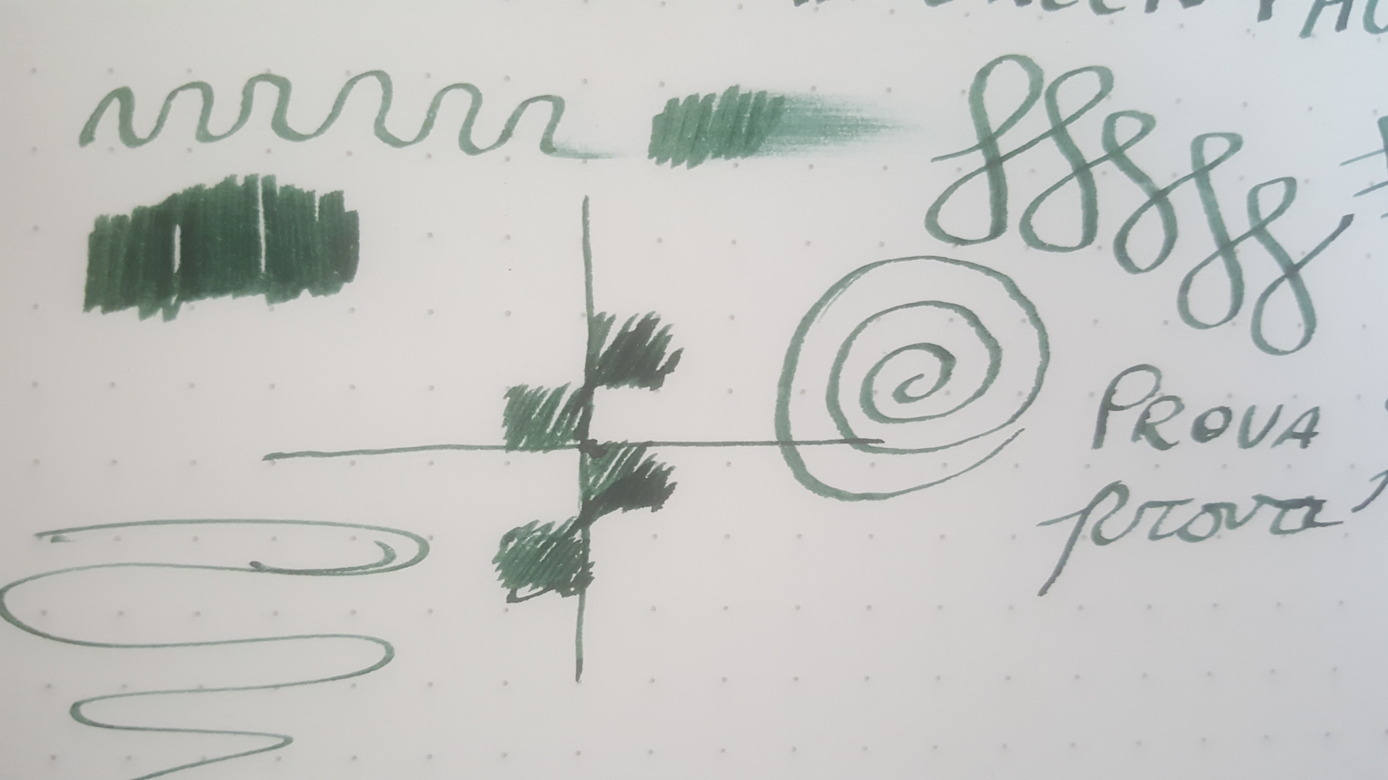 Mi è piaciuto fin da subito: brillante mentre è ancora bagnato, scurisce asciugando, assumendo una bella sfumatura di colori, dal verde chiaro al verde foresta (ça va sans dire). Risalta su carta candida, ma è altrettanto gradevole su carta avoriata o paglierina. Molto particolare lo shading: oltre alla variazione di colore tra tratti chiari e pieni, questi scuriscono ai bordi. Non ci sono sfumature gialle o brune. Su carta di qualità (come la EcoQua) non si notano difetti (spiumaggio, see-through, bleed-through), il flusso è piuttosto ricco (grazie anche alla fluidità dell'inchiostro) e la scorrevolezza è molto buona. Unici "difetti", il tempo di asciugatura un po' alto e la mancata resistenza all'acqua.