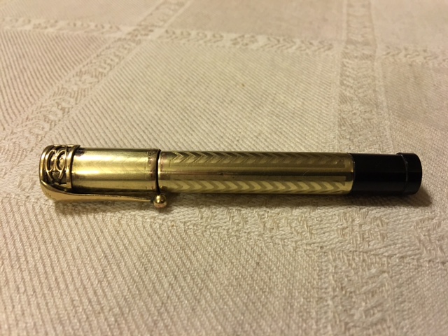 Quella appena acquistata (ad un prezzo decisamente basso) ha solo il cappuccio diverso, con un anellino sulla sommità e sotto la clip l'applicazione di una banda dorata con uno strano disegno (non floreale, pare un fiocco). Per il resto la penna mi pare identica e in buone condizioni. La scatola non è quella sua ma credo sia comunque "vintage", porta la scritta Magic Fountain Pen "marca di fabbrica".